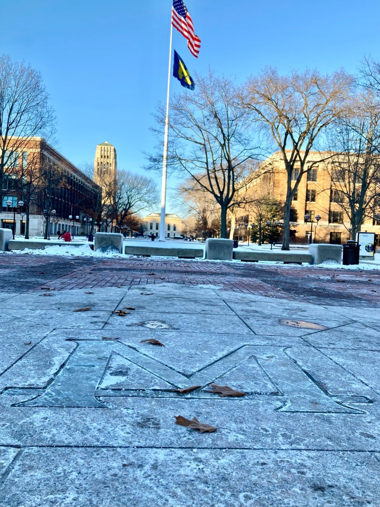 The middle of campus. There is a superstition that stepping on the M leads to bad grades