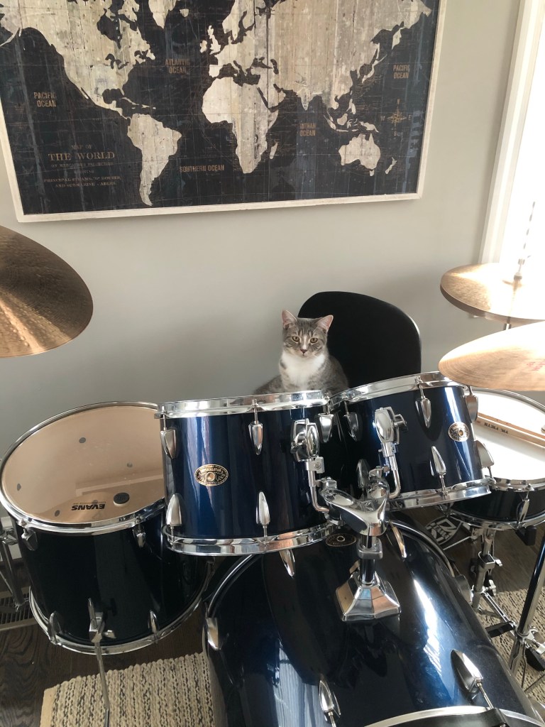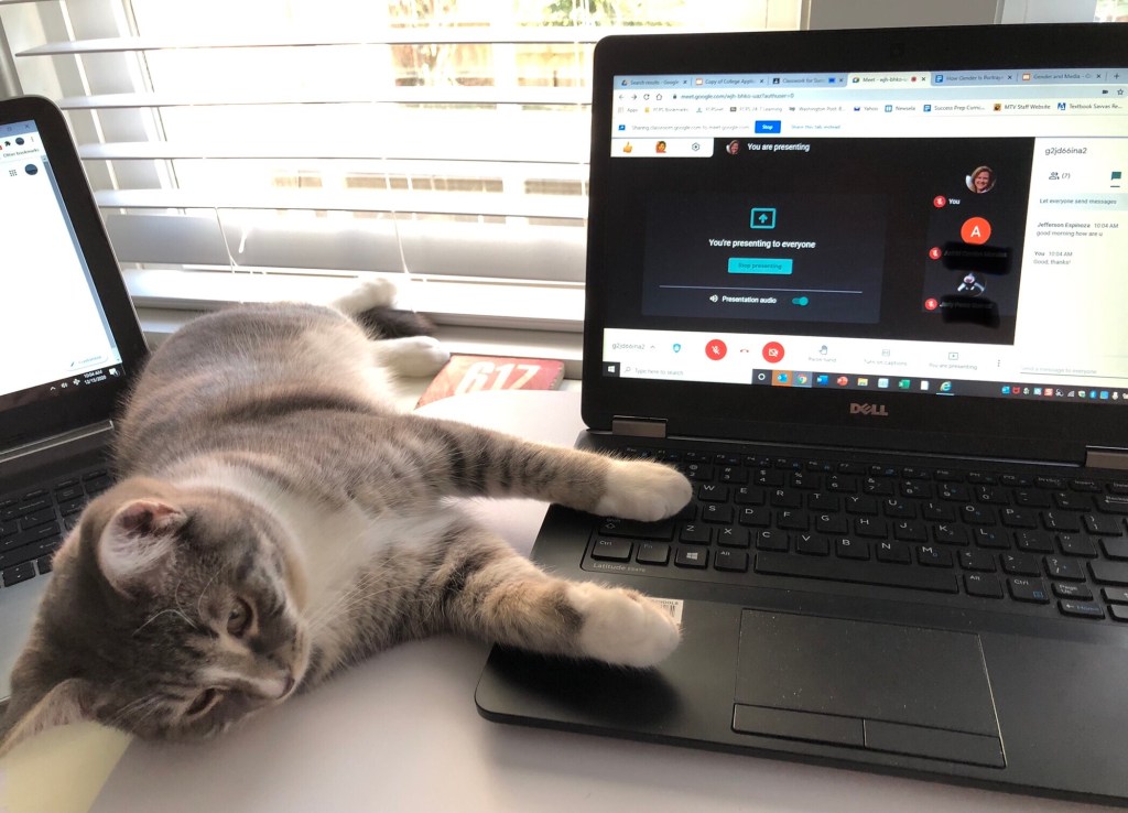 This was what happened to me a few weeks ago during a virtual faculty meeting. My cat walked across my keyboard and turned on my microphone. I’m still not sure which key he stepped on, but it isn’t the first time he’s discovered things about my laptop that I was unaware of.  (Who knew it had airplane mode?)