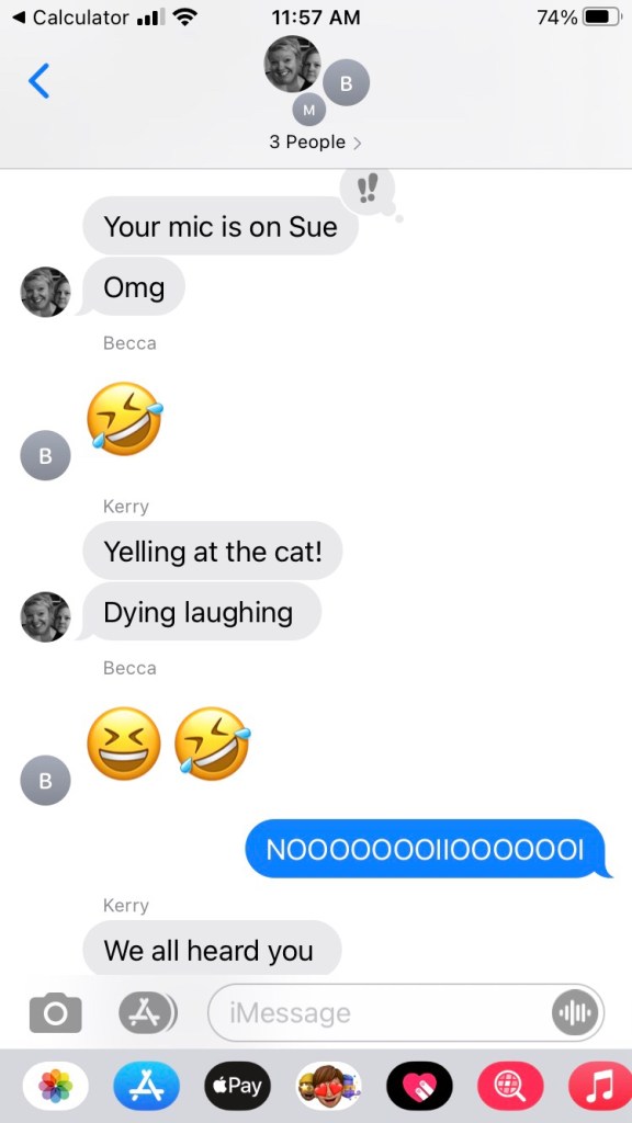 It didn’t take long for my work friends to start blowing up my phone. The first message I received is below. Mercifully, the assistant principal (a cat owner herself, as it turns out) immediately muted me, so the only comments that went public were brief. I’m told there was an awkward silence after my outburst and then my principal continued on with his remarks.